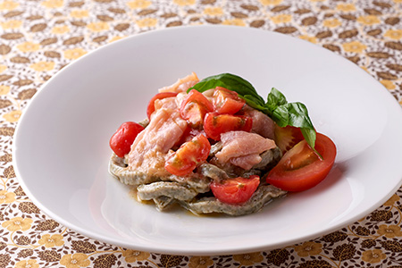 「三草茶の冷製生パスタ~桃ジャムソース添え~」