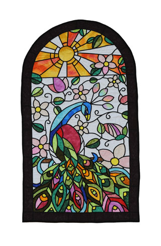 この作品は大きく羽を広げているくじゃくが朝日の光をあびてキラキラ輝いている姿をイメージして作りました。一番こだわった点は羽の配色です。光の反射で色々な色に変化している様子を表現しました。4ヶ月間かけて製作してきました。一番苦労したのはキルティングです。周囲のキルティングが豪華になるよう工夫しました。