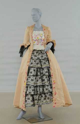 テーマのFeminiteはフランス語で「女性らしさ」という意味です。デザインは、ロココ時代の優雅で華やかな女性をイメージしフリルをあしらいました。そして、ローブの端と中のビスチェに刺繍糸、ビーズ、リボンで刺繍をし、より可愛らしく仕上げました。ローブの端の刺繍台は30㎝に切り、班員が分担して刺繍しました。 -